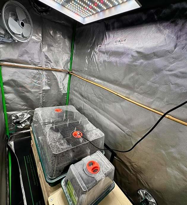 Проращивание не самый интересный, но все же важный этап цикла, к которому нужно относиться с особым трепетом. Начало жизненного цикла формирует основу всего грова и во многом влияет на конечный результат, поэтому для данного процесса у меня имеются специальные мини-теплички, в которых поддерживается высокая влажность, но в то же время обеспечивается приток свежего воздуха. Само рабочее пространство – это бокс размером 120 х 60 х 200 см. В качестве освещения использую светильник Mars Hydro TS1000, а за воздухообмен отвечает канальный вентилятор HF-125, оснащенный угольным фильтром Magic Air 350/125.